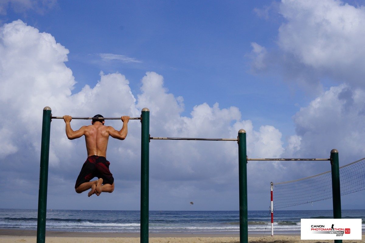 Judges Hai Dong commented on the winning Le Anh Vu’s photo: “This photo followed the “Human and The Sea” theme to the letter. The man’s strength as he lifts himself in his ‘pull-up’ is clear. The beams are raised one by one, which highlights the journey of the man’s strength. Coincidentally, the clouds follow the same progression in the background, making for a stunning effect. The technique and composition are both superb. His skin, the blue sky, even the volleyball net, all add to the balance of this photo.”
