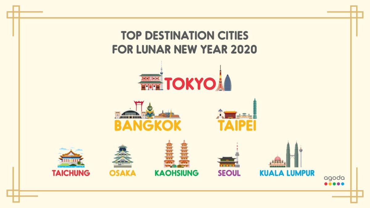 Tokyo, Bangkok and Taipei are the top three destinations for travelers from across Asia to celebrate the Lunar New Year. This year, Tokyo nudged Bangkok off pole position, steadily climbing the ranks from third place in 2018 to the top spot, while Taipei moves to third place.