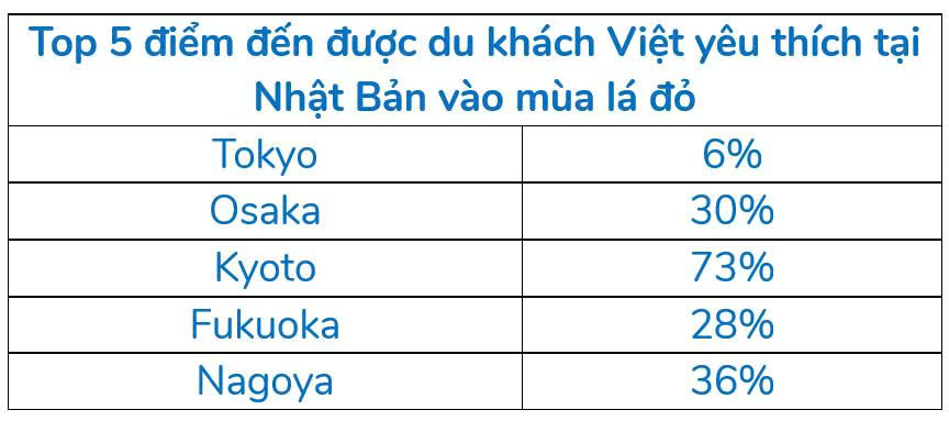 Japan also continues to be a must-visit destination during the autumn season, with Vietnamese travel interest increasing 24% compared to the summer. Leading the top list is Tokyo, which saw a 6% rise in searches as travelers look to experience its breathtaking foliage landscapes. Osaka followed with 30% growth in travel interest, while Kyoto (73%), Fukuoka (28%), and Nagoya (36%) rounded out the top five.