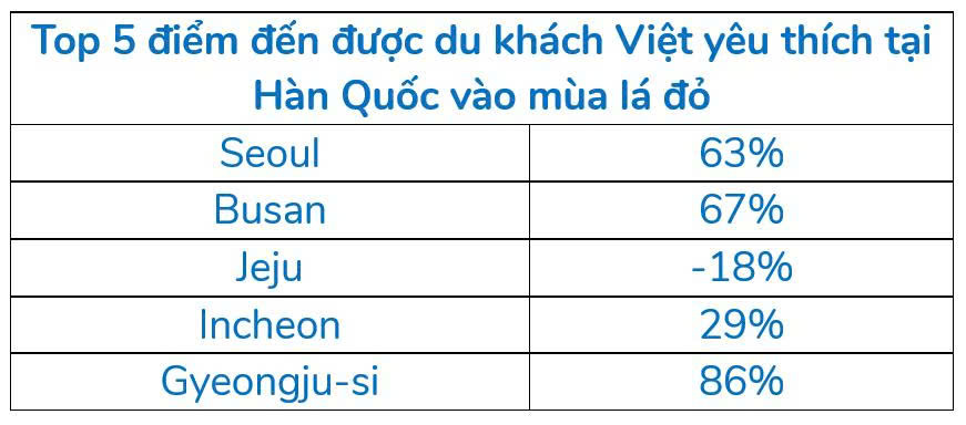 Based on searches made by Vietnamese travelers for check-ins during the autumn season (October – November) compared to summer months (June-July), it’s clear that Vietnam’s enduring love for Korea remains strong, especially for the red-leaf season. Seoul and Busan lead the top five favorite destinations in Korea for Vietnamese travelers, with increases of 63% and 67% respectively, followed by Jeju, Incheon (29%), and Gyeongju-si (86%).